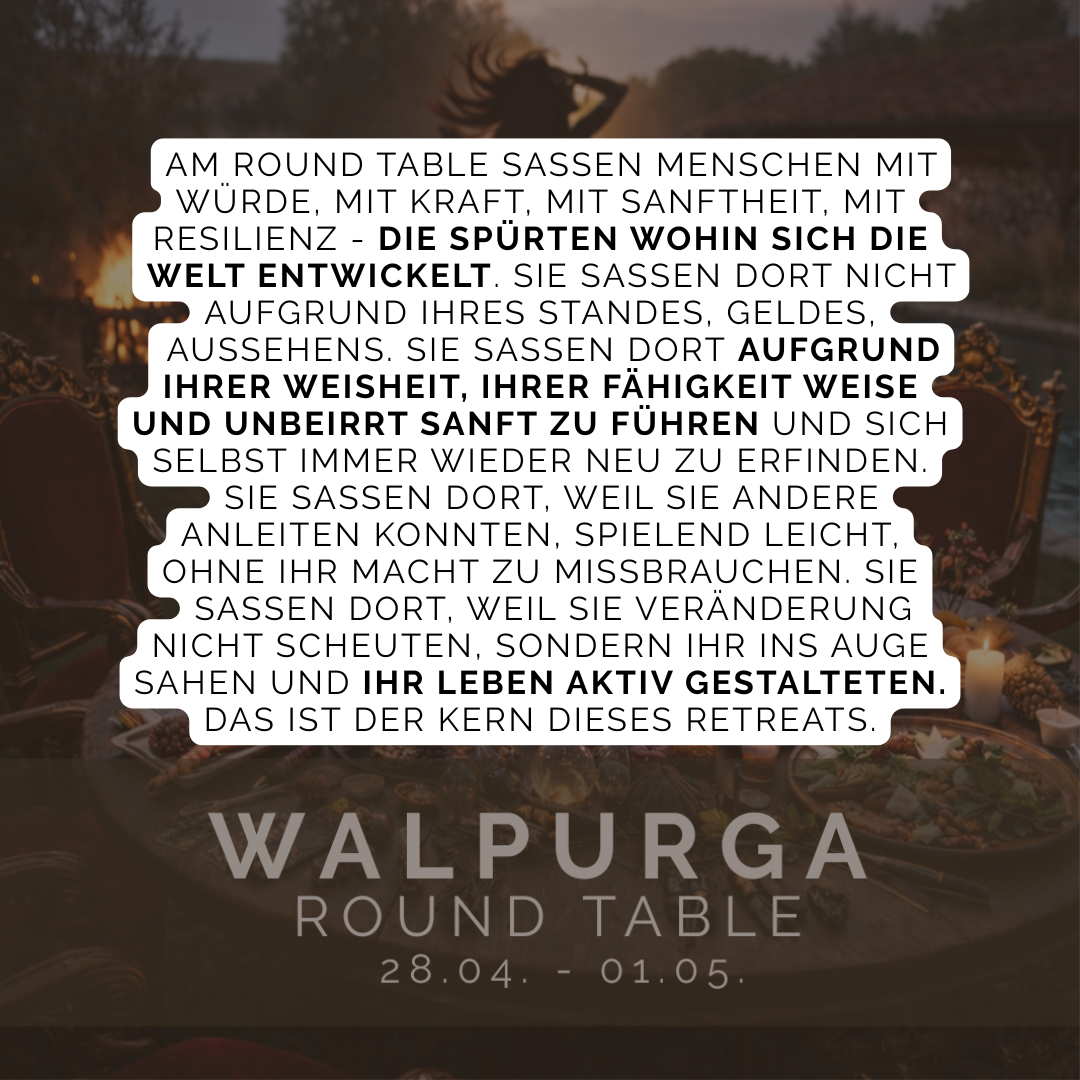 Am Round Table saßen Menschen mit Würde, mit Kraft, mit Sanftheit, mit Resilienz – die spürten wohin sich die Welt entwickelt. Sie saßen dort nicht aufgrund ihres Standes, Geldes, Aussehens. Sie saßen dort aufgrund ihrer Weisheit, ihrer Fähigkeit weise und unbeirrt sanft zu führen und sich selbst immer wieder neu zu erfinden. Sie saßen dort, weil sie andere anleiten konnten, spielend leicht, ohne ihr Macht zu missbrauchen. Sie saßen dort, weil sie Veränderung nicht scheuten, sondern ihr ins Auge sahen und ihr leben aktiv gestalteten. Das ist der Kern dieses Retreats.
